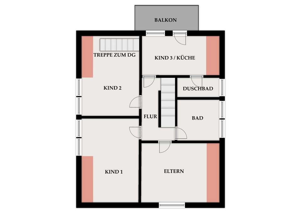 Im Obergeschoss finden Sie die privaten Schlafräume: das Elternschlafzimmer, drei weitere Schlafzimmer sowie ein großes Masterbad. Ein Zimmer verfügt über einen eigenen Balkon und ein eigenes Bad. Ein anderes hat einen Zugang zum ausgebauten Dachgeschoss – ideal als Büro, Jugendzimmer o. Ä., zumal dort auch ein WC vorhanden ist.