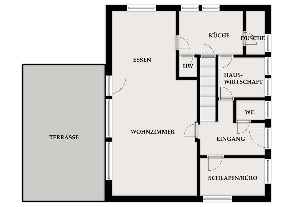 Im Erdgeschoss befinden sich eine Küche mit angrenzendem Duschbad, ein großzügiger Wohn- und Essbereich mit Zugang zur sonnigen Süd-West-Terrasse, ein Büro (auch als Schlaf- oder Gästezimmer nutzbar), ein Gäste-WC sowie ein Hauswirtschaftsraum, der bei Bedarf zu einem weiteren Raum umgestaltet werden kann.